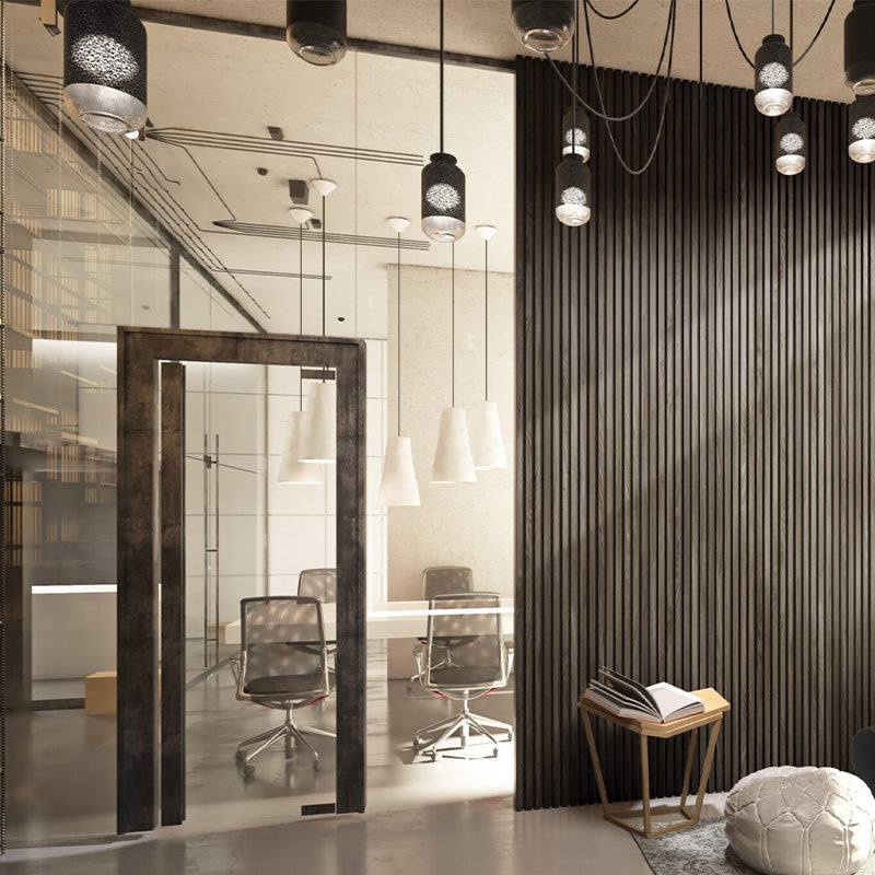 I used the walnut acoustic panels in the cathedral height entryway for a client. It completely transformed the entire downstairs while providing much needed sound dampening! We were also able to hide the door going out into the garage. The ho-hum entrance became a stunning and welcoming place to great guests!